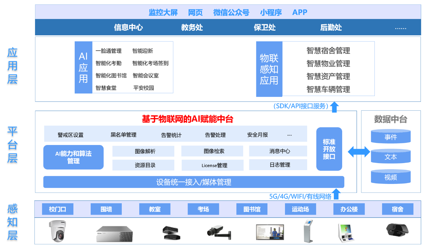 2、采集的数据传输到我们“基于物联网的AI赋能中台”,利用AI能力和算法进行基本的图像解析、人脸比对和行为分析,同时与学校的业务数据中台实现互联互通,以此构建丰富的上层AI业务应用和物联感知的业务应用。