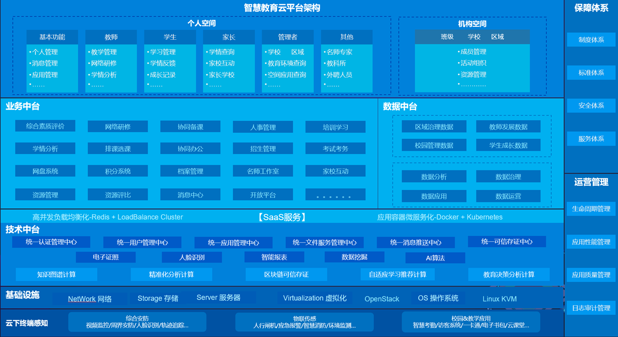 智慧教育云平台:利用云计算等技术手段,建立优质数字教育资源共建共享平台环境,同时满足教育用户通过网络学习空间以及各种信息终端完成教学、学习、 教研、管理、社交等方面的需求,促进信息技术与教育教学全面深度融合。