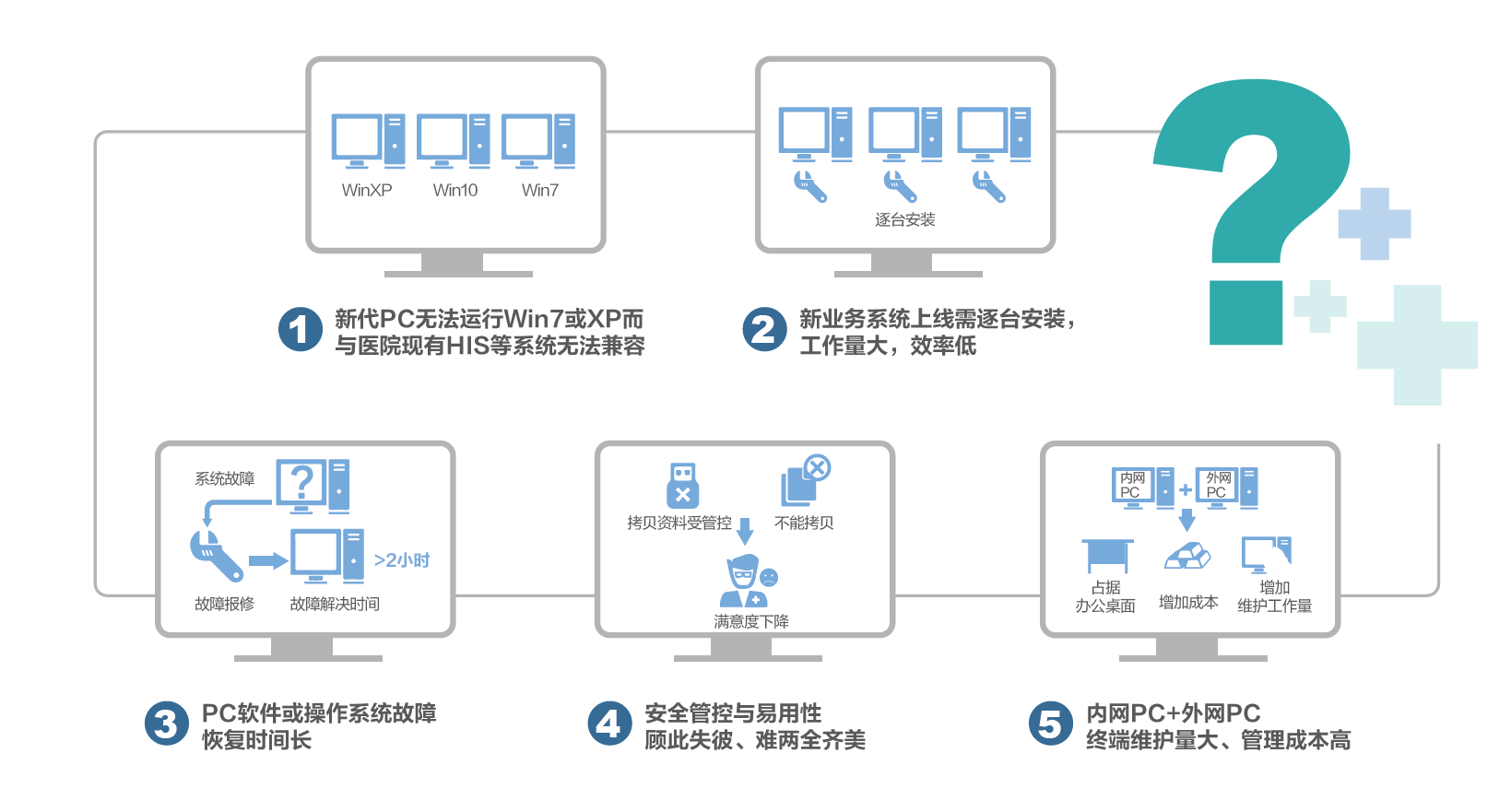 为满足人民群众日益增长的健康需求,各地持续投入医院、公共卫生中心、医疗产业园建设,桌面终端数量大幅提升。同时,新业务系统不断增加,桌面终端运维挑战日益明显: