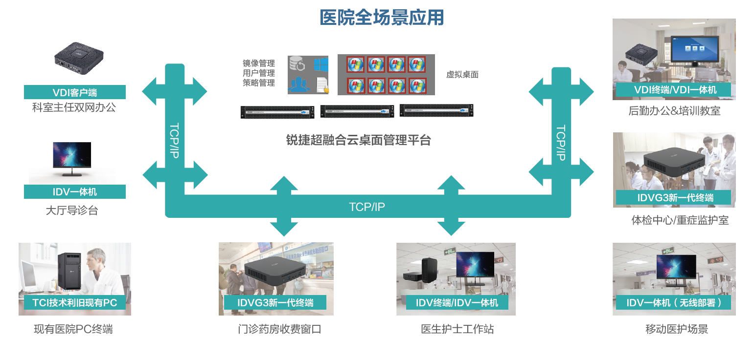 智慧医疗云桌面解决方案完美融合TCE、DCE及ACE三种引擎技术架构,实现集中管控的同时,又兼具了三种不同技术架构的云桌面各自的优势,可根据不同的业务场景需求进行相应方案架构的选择,既客服了传统PC桌面管理难,同时也解决了传统VDI桌面体验效果差等局限性问题,可适用于医院全场景,是医疗行业云桌面的理想方案选择。