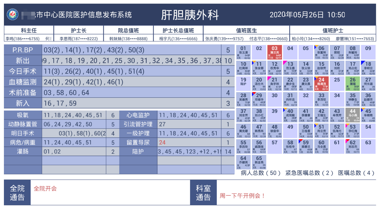 经过采用医院综合信息发布系统通过链接HIS系统的数据库,同屏实现护理电子看板的功能,从而实现病区信息一屏化。系统可实现输液实时监控、病人信息一览、病区工作动态展示、医护排班、电子看板、输液数据报表等功能。